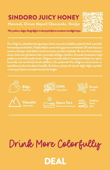 Dağın ritmiyle, bilimin hassasiyeti birleşir; her aşama kontrollü, bir o kadar da bilinçli olarak şekillenir. Her yudumda Prau Dağı’nın temiz havası ve topraklarının derin karakteri hissedilir. Bu kahve, yalnızca bir içecek değil, dağla, toprakla ve deneysel işleme sanatıyla kurulan bir bağdır.
